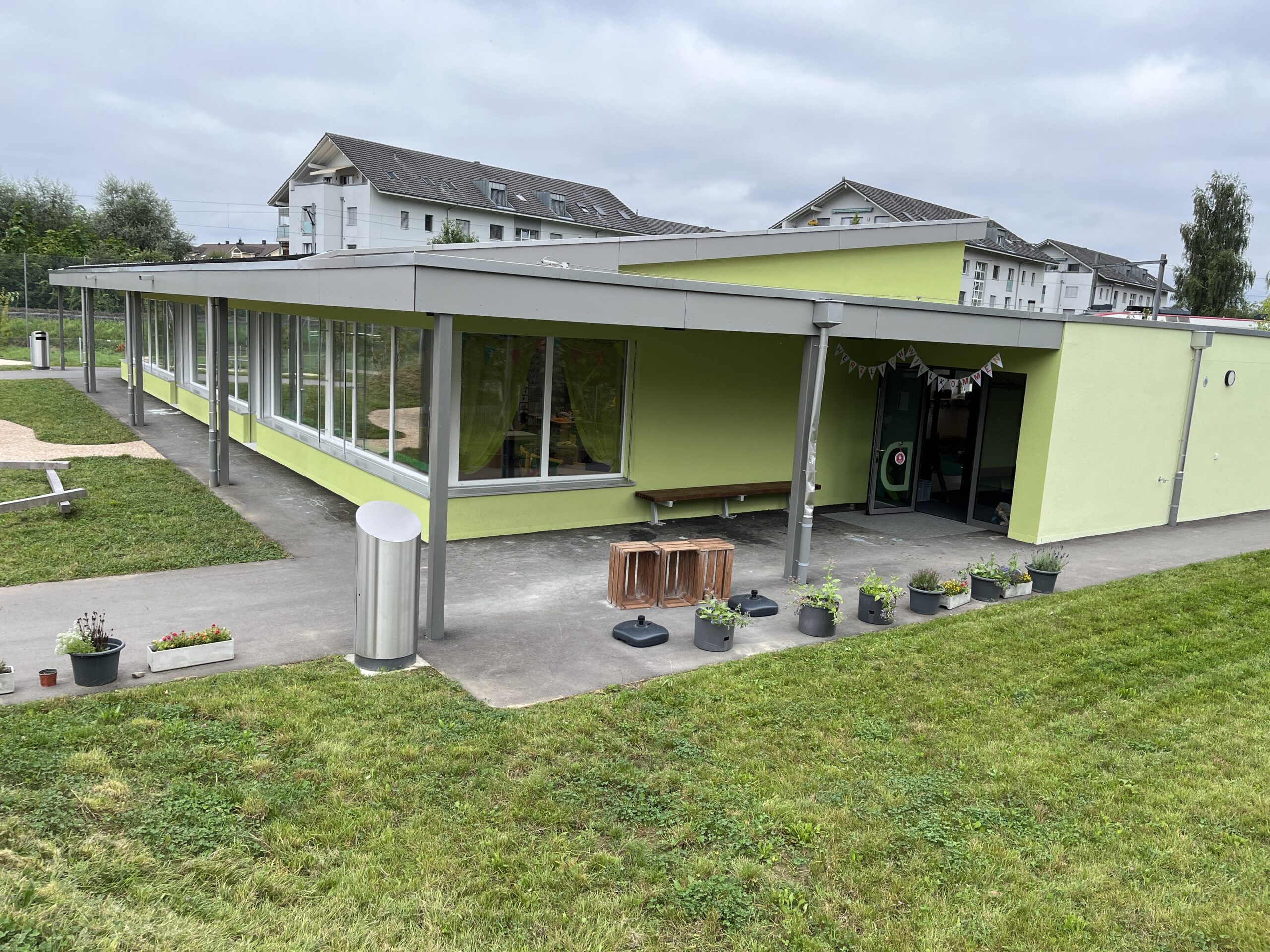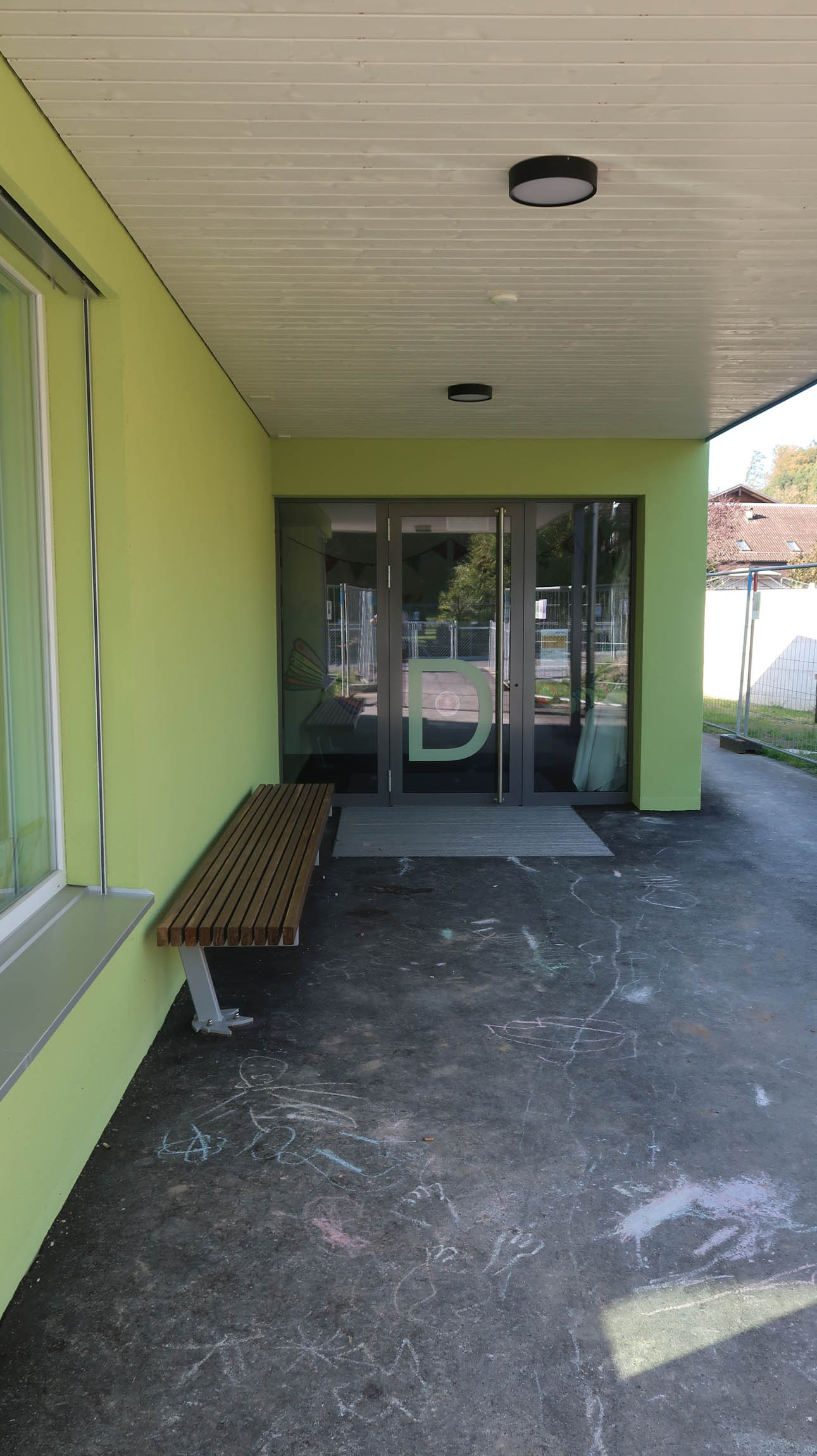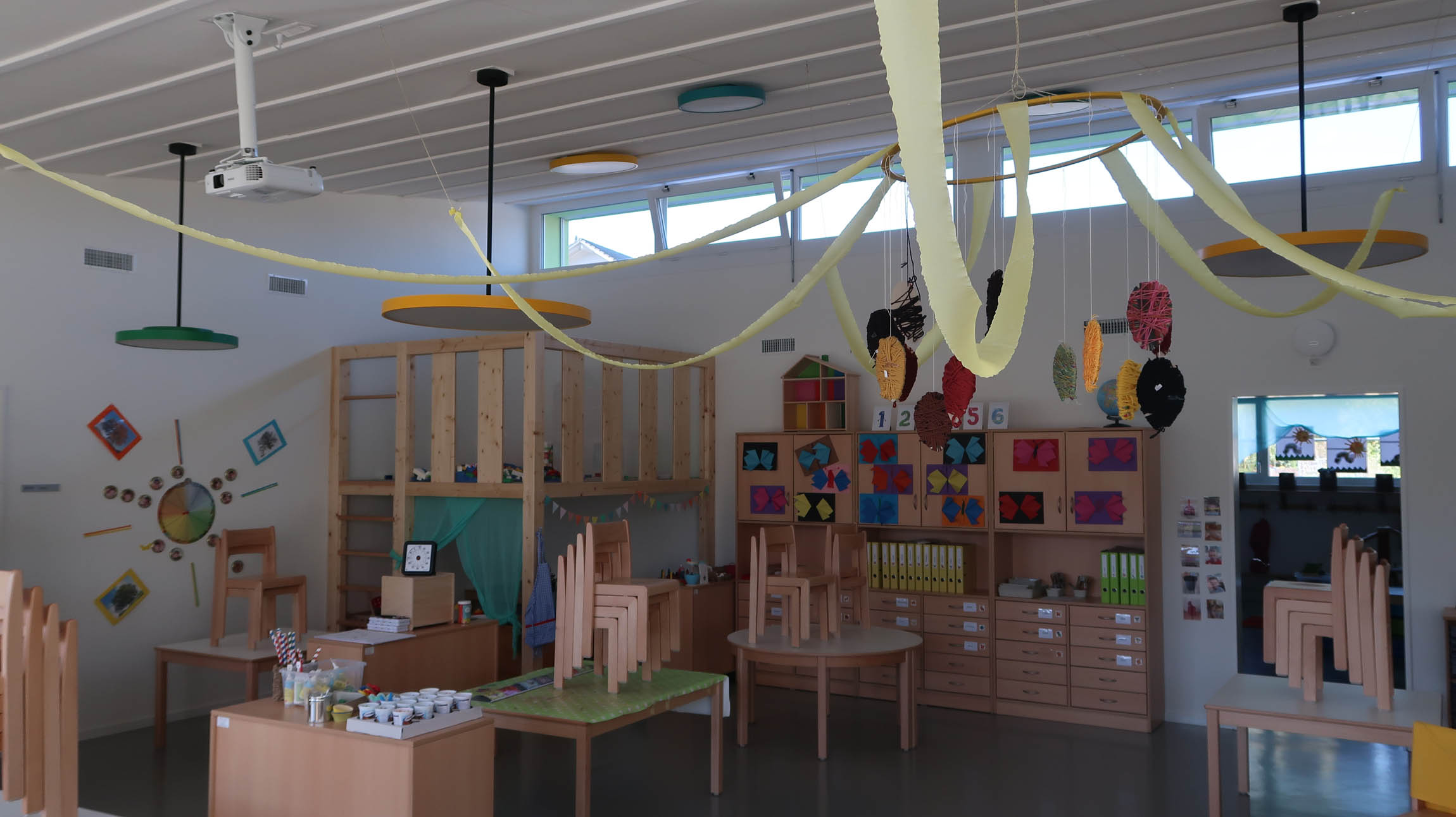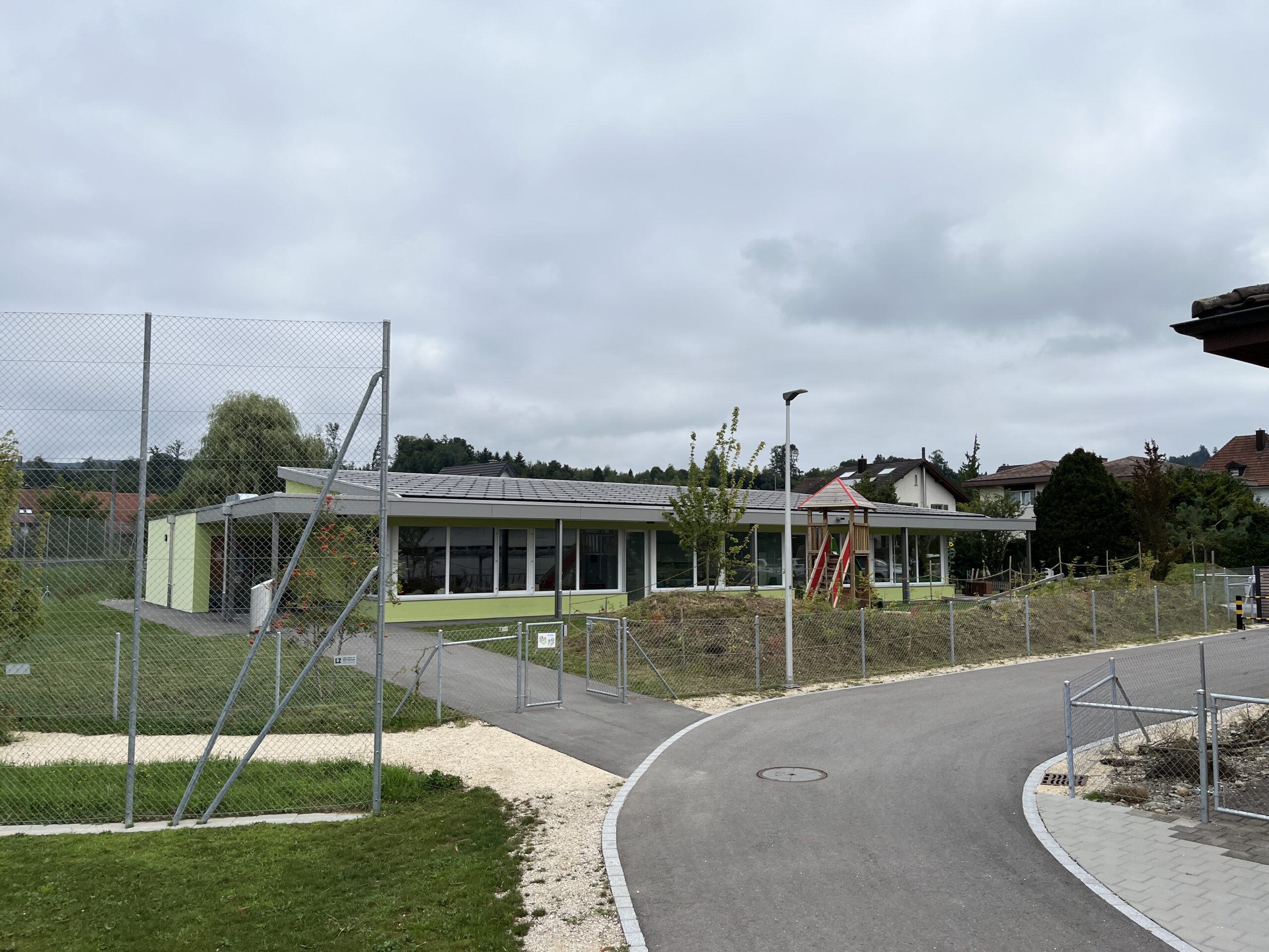 Der eingeschossige Neubau des Kindergartens bietet dank der Bandfenster sehr helle und einladende Räume. Die Solaranlage produziert ausreichend Strom, um auch den angrenzenden bestehenden Kindergarten mit Energie zu versorgen. Der naturnahe Spielplatz ergänzt das Ensemble und steht auch der Allgemeint zur Verfügung.