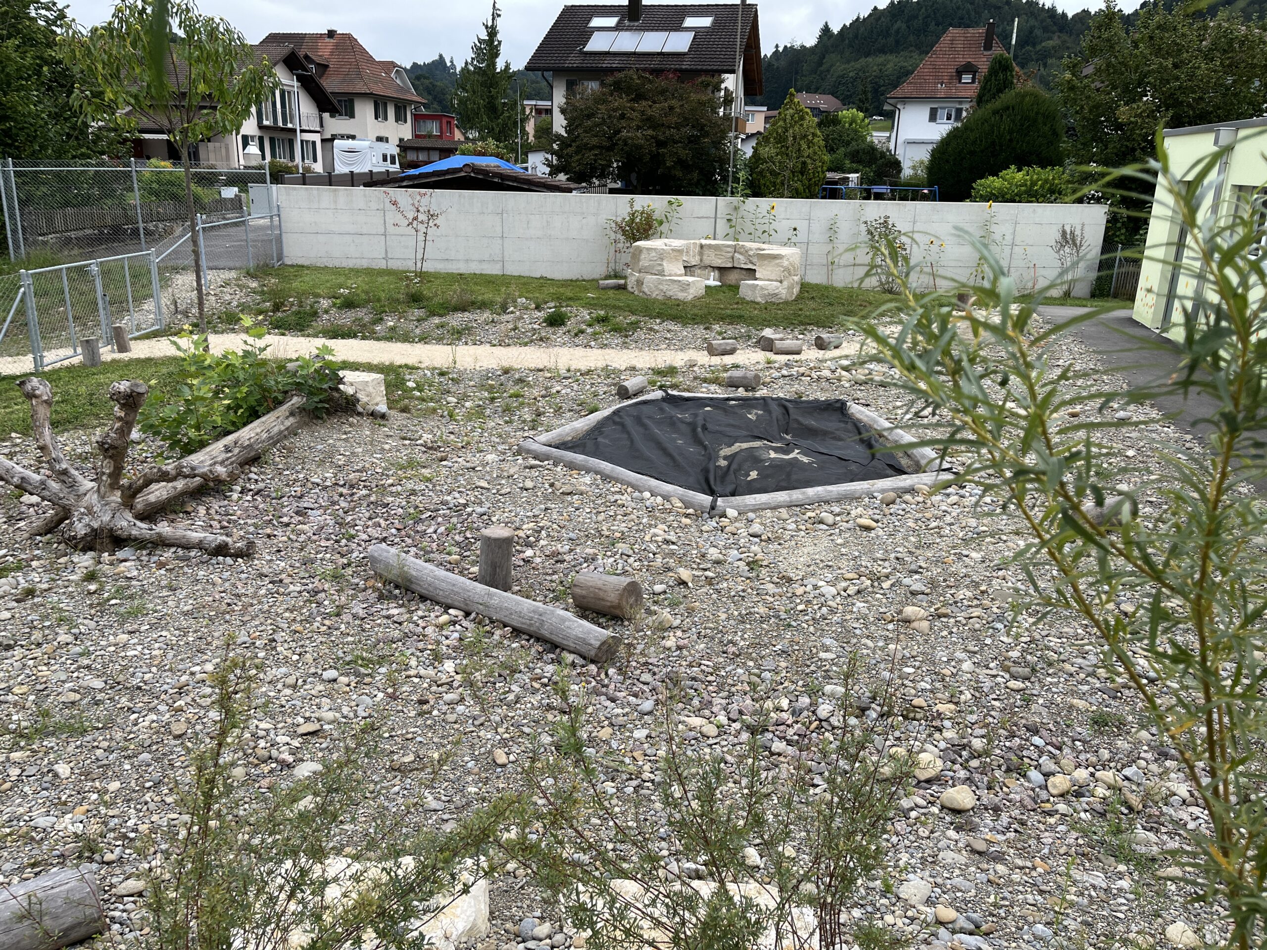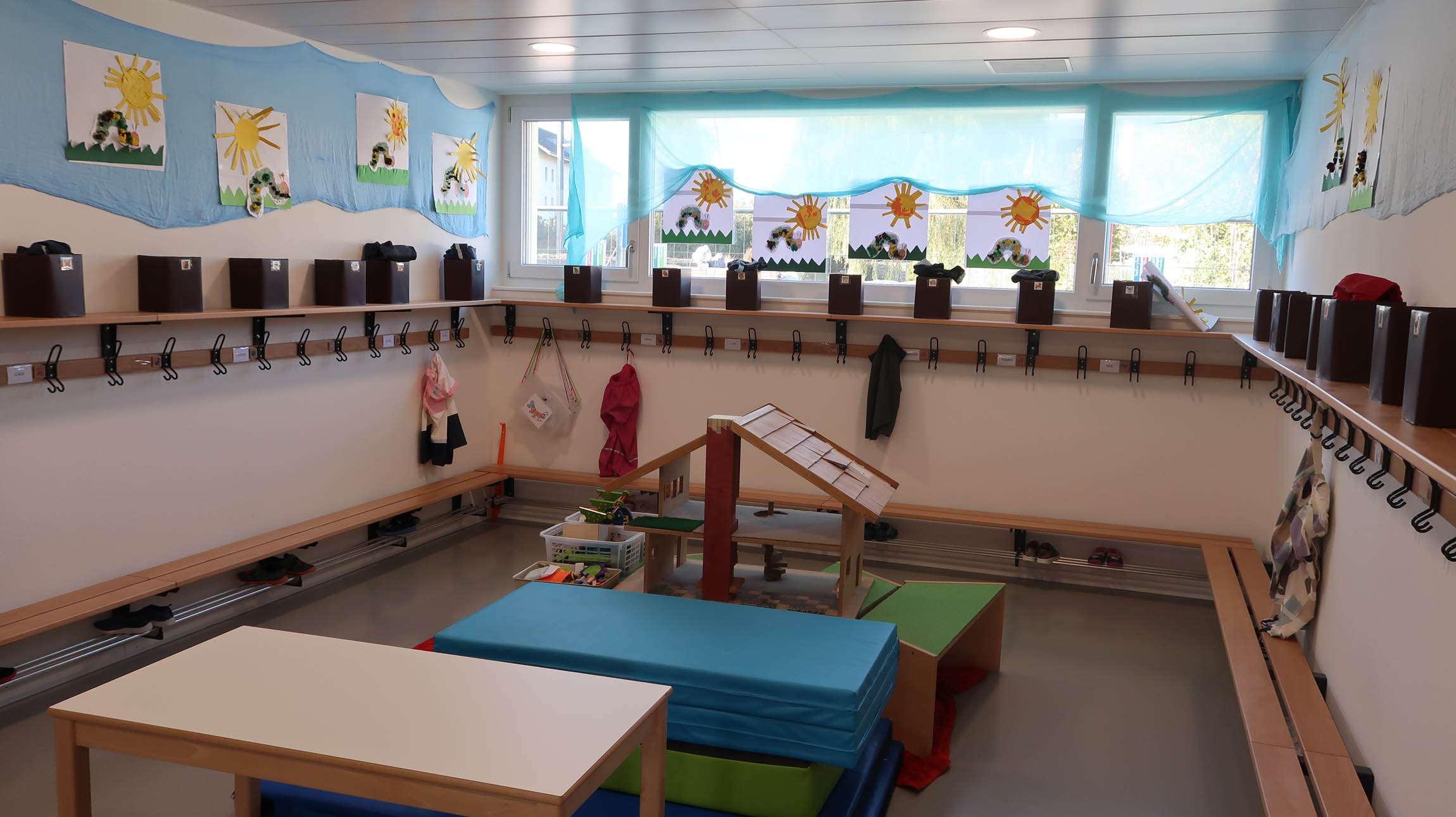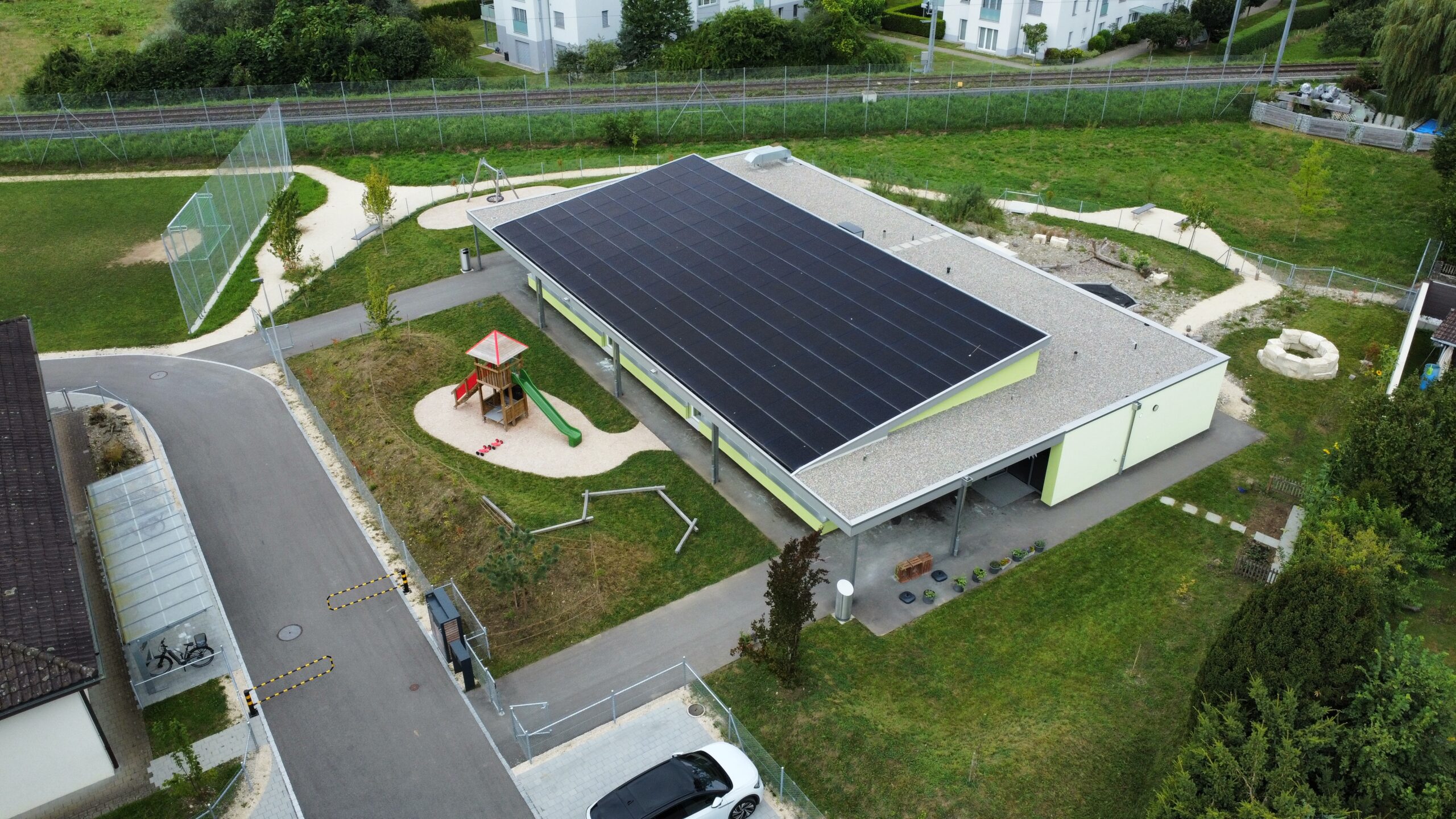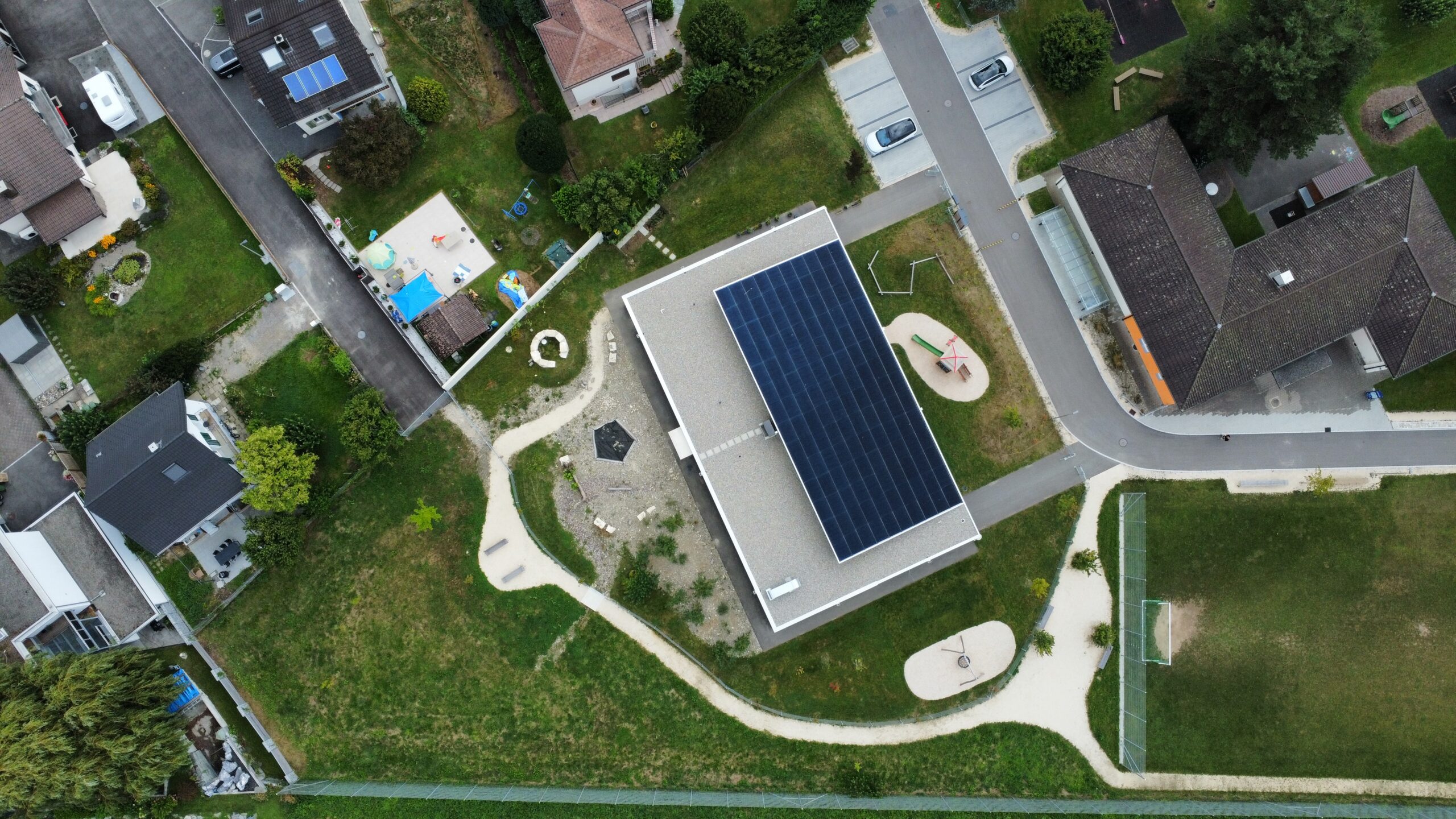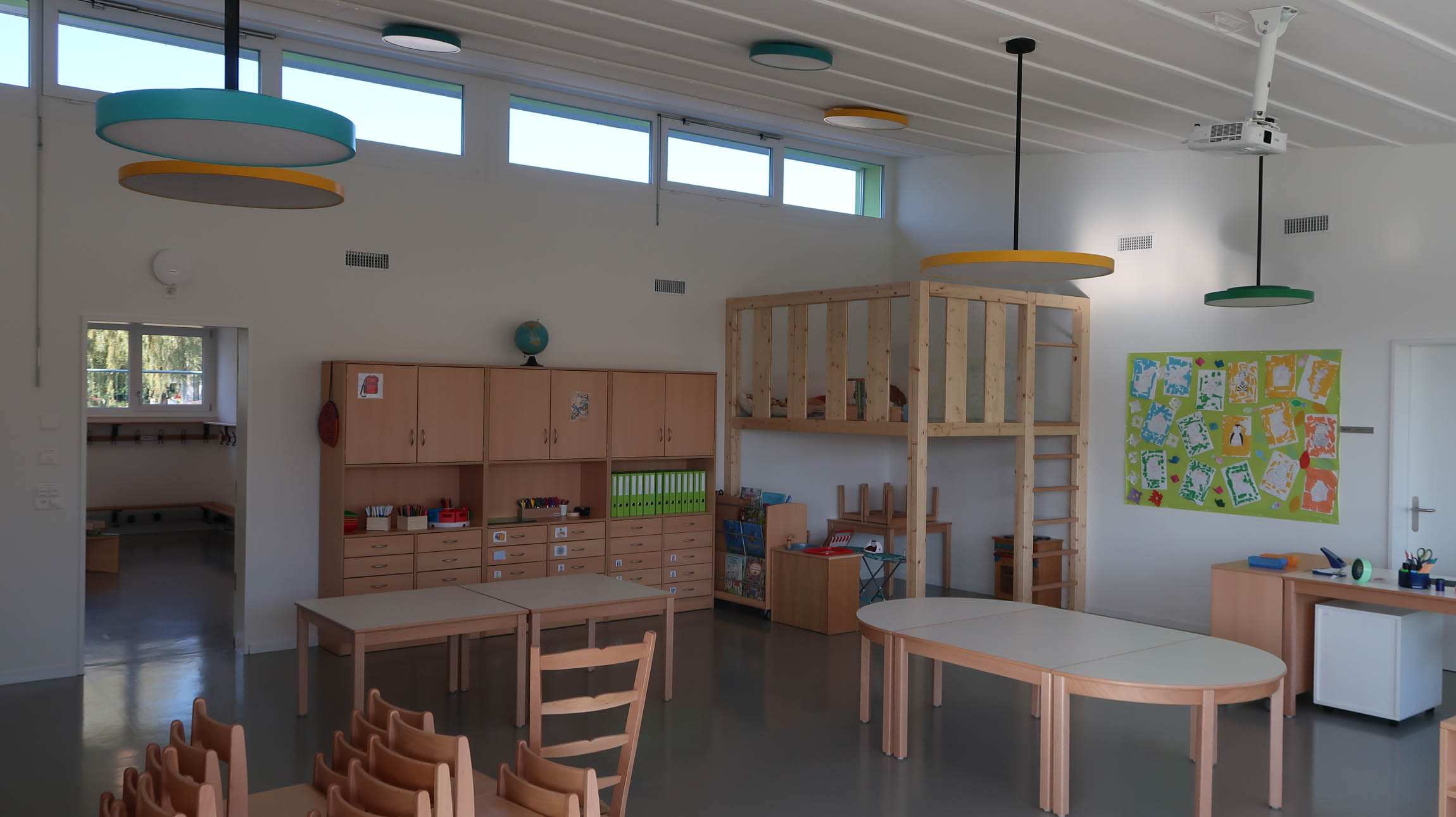 Der eingeschossige Neubau des Kindergartens bietet dank der Bandfenster sehr helle und einladende Räume. Die Solaranlage produziert ausreichend Strom, um auch den angrenzenden bestehenden Kindergarten mit Energie zu versorgen. Der naturnahe Spielplatz ergänzt das Ensemble und steht auch der Allgemeint zur Verfügung.