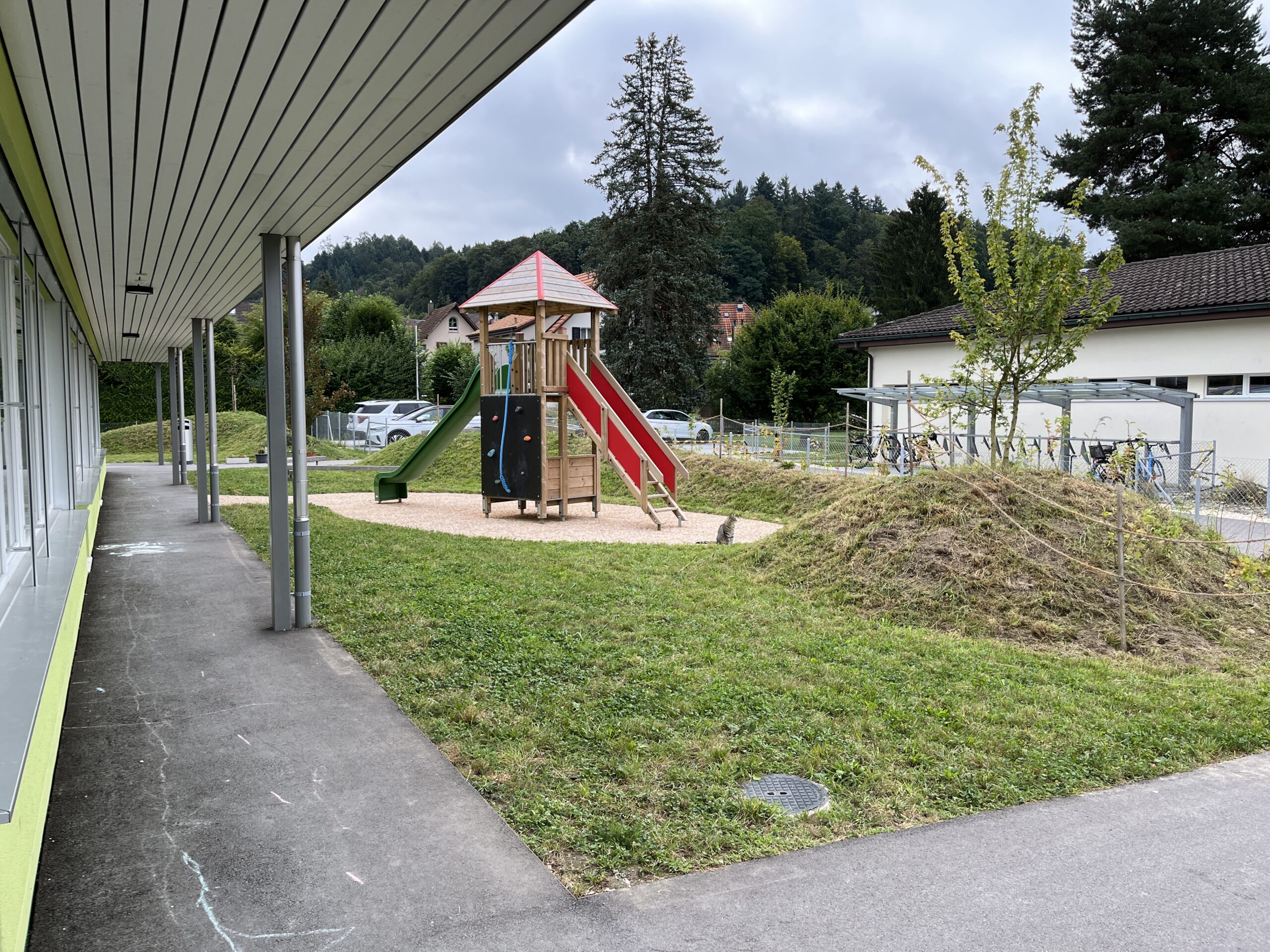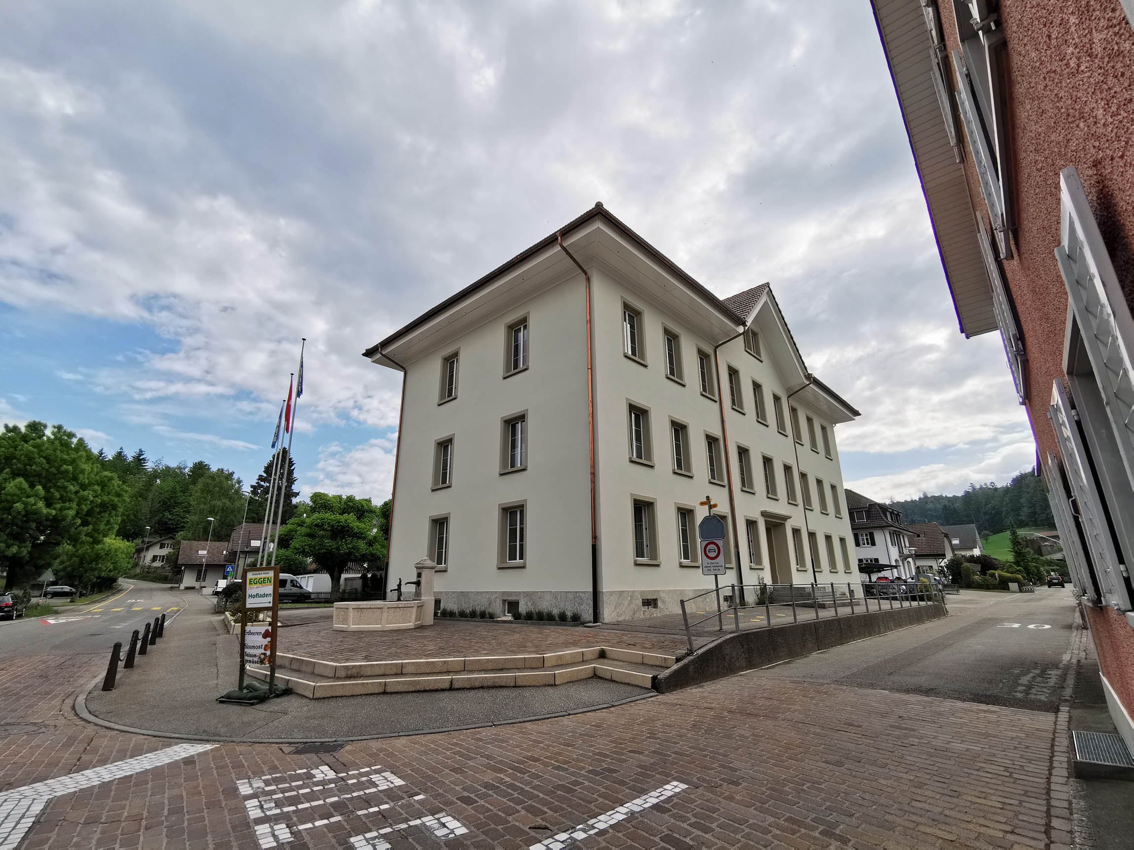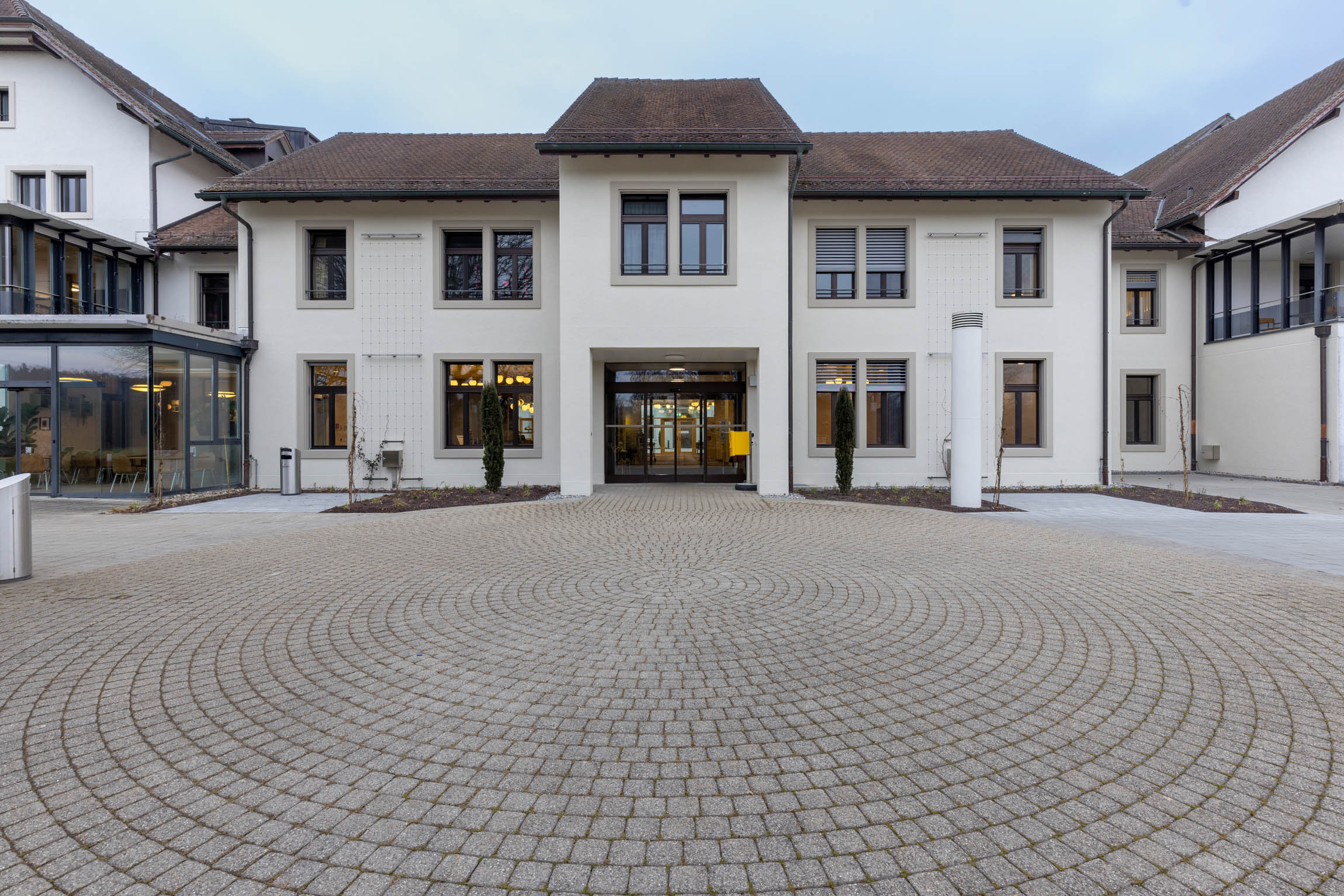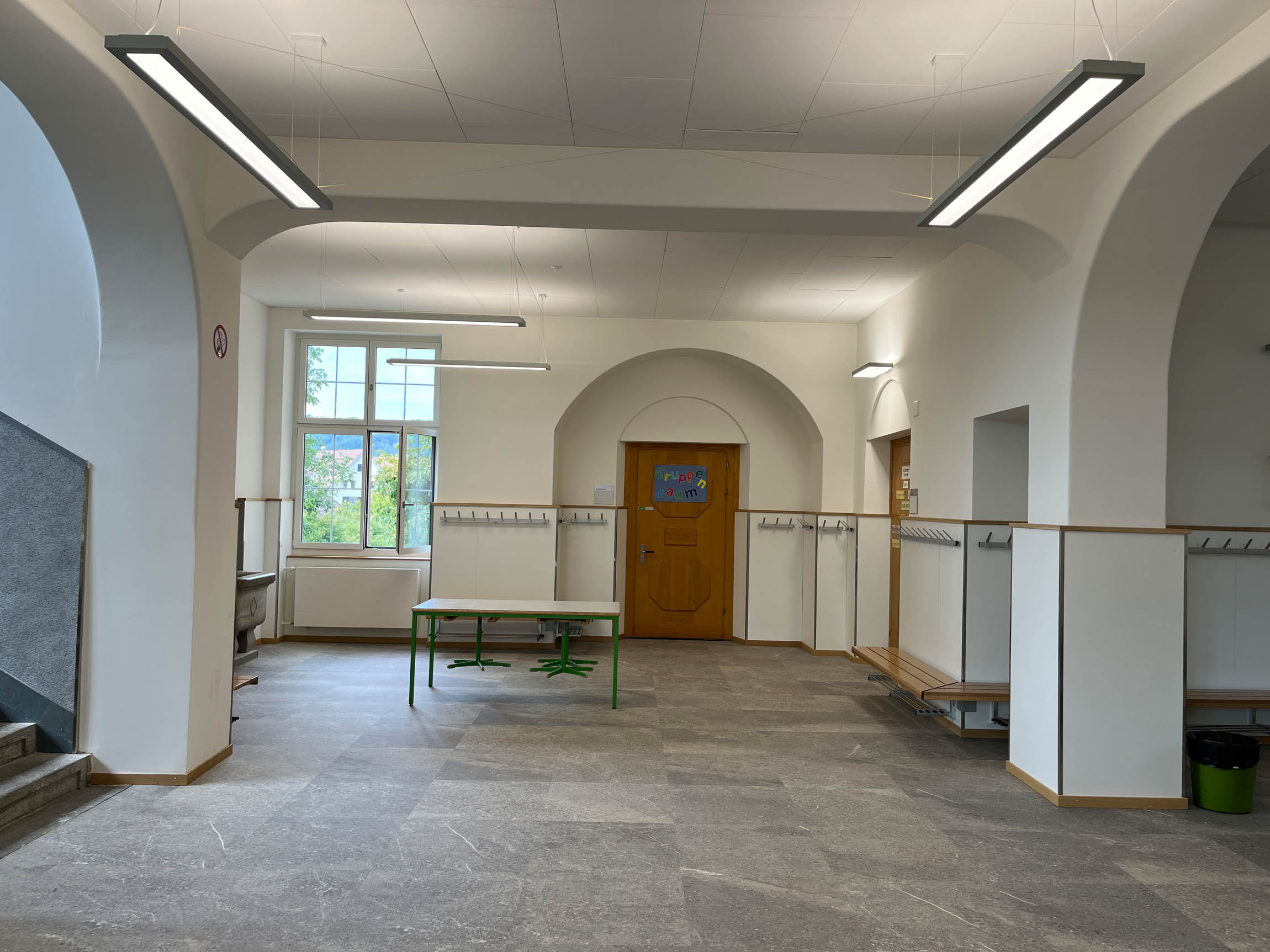 Dieses altehrwürdige Schulhaus wird etappenweise erneuert. Im Jahr 2022 wurden dank den Lukarnen die Schulräume im Dachgeschoss massiv aufgewertet. 2023 folgte die Modernisierung der grosszügigen Eingangshalle.