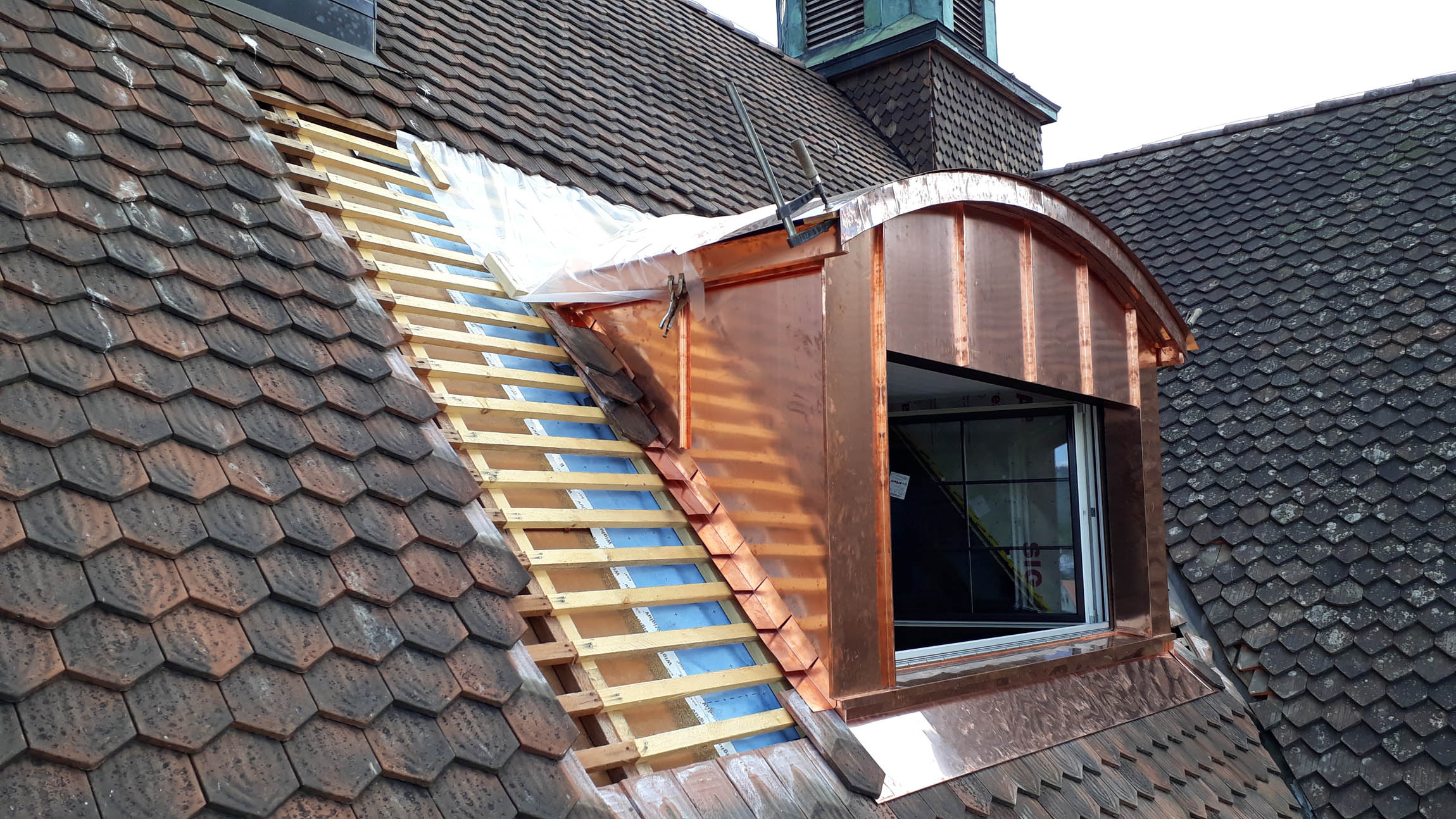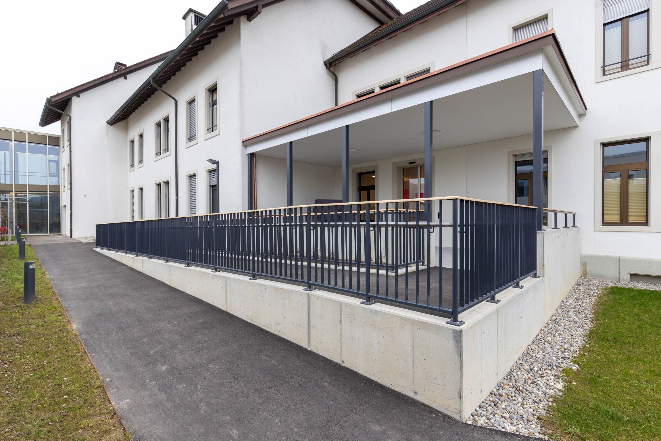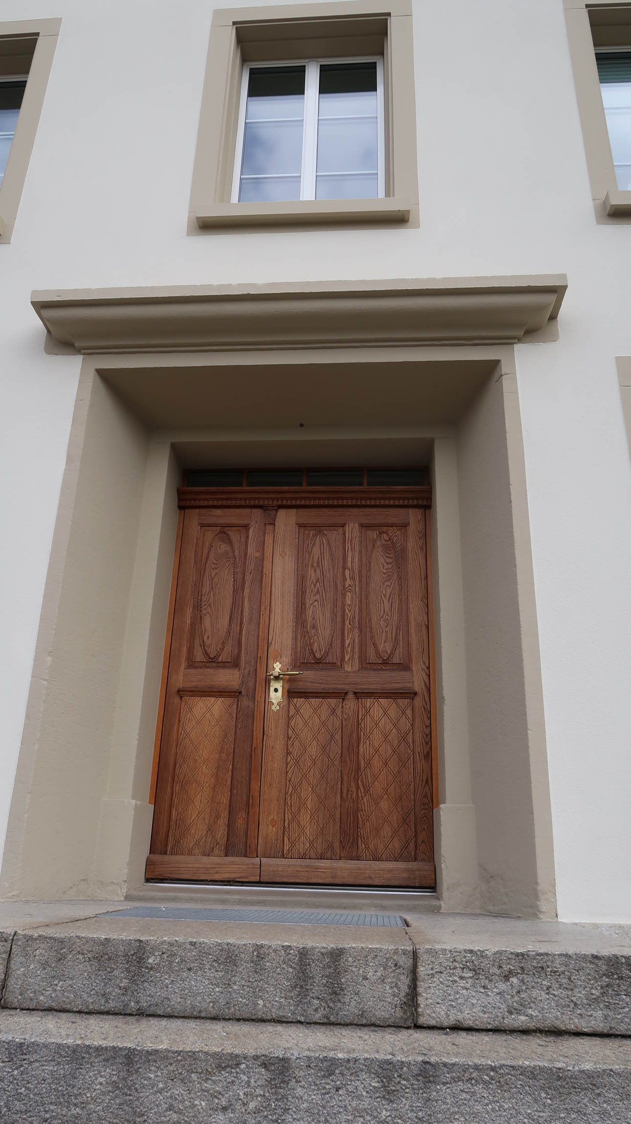 An diesem historisch wertvollen Schulhaus wurde das Dach vollständig erneuert, die alten Fassaden wurden risssaniert und die Fassade des hinteren Anbaus wurde komplett ersetzt und gestalterisch und harmonisch an den Bestand angepasst.